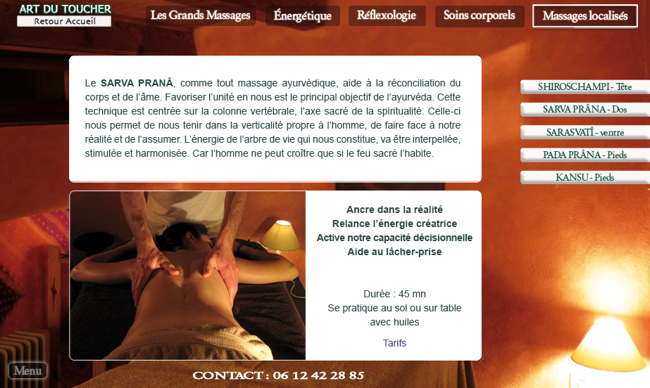 Accueil - Praticien - Carte des massages- Tarifs- Formations - Galerie photos - Contacts - Liens - Massage drainant ayurvedique Abhyanga - Massage relaxant ayurvedique Pichauli - Massage tonique ayurvédique du Kérala - Massage harmonisant tibétain Ku Nye - Massage relaxant Californien - Massages aux pierres chaudes Fuji - Massage thailandais Nuad Bo Rarn- Massage d'harmonisation énergétique ayurvedique des Points de Marmas- Massage d'harmonisation energetique ayurvedique des 4 Mandalas - Massage d'harmonisation energetique ayurvedique du dos et 7 chakras - Reflexologie plantaire - Reflexologie palmaire - Massage ayurvedique de la tete Shiroschampi - Massage ayurvedique du dos Sarva Prana- Massage ayurvedique du ventre Sarasvati- Massage tonique ayurvedique des pieds Pada prana - Massage ayurvedique des pieds avec un bol tibetain Kansu